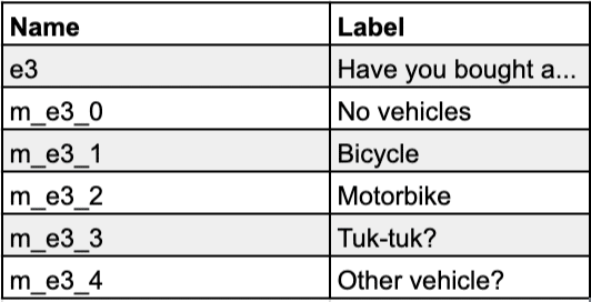 - The other exception: There is one type of compound variable name where an underscore does not work well: other variables capturing open-ended responses after a selection of “Other, specify” (or similar) has been made. The problem is that multi-select fields (select_multiple fields as they’re called in SurveyCTO) usually result in a series of dummy (0/1) variables in the dataset, and they are using underscores for differentiation. For example, the respondents might make the following selection as a response to the question “Which of these assets do you own?”: 1. Bicycle ✅ 2. Microwave ❌ 97. Other ✅, resulting in asset_1==1 asset_2==0 asset_97==1 in the dataset. It would then be tempting to name the variable for the open-ended question “What other asset do you own?” “asset_other”, but this would cause problems if one wanted to group the asset dummy variables for analysis. For example, mrtab asset_* would result in an error as the command mrtab cannot handle a combination of numeric and string variables. To avoid this, the rule is to just concatenate the variable name and “other”, as in “assetother” (without an underscore).