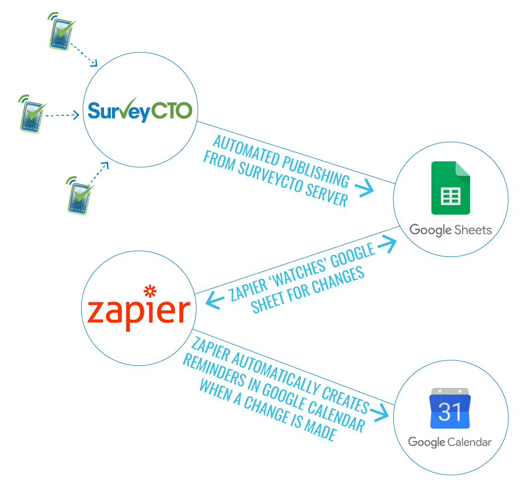 • Zapier “zaps” connect services and applications (like SurveyCTO, Google Sheets, and Google Calendar) in automated tasks that trigger actions in one service when new data is available in another service.