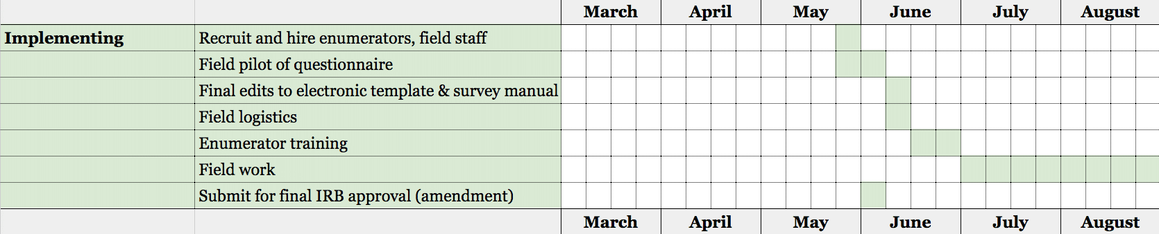 All of these tasks can be completed before or after arriving in the field, depending on time constraints, your knowledge of the in-country context, and whether you already have contacts on the ground. A range of timings is presented in the figure, from the earliest they can possibly begin (if working pre-field) to the latest date for completion (if working in-the-field). No task should take the full time allotted.
